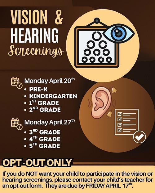 We are fortunate to have Project Vision and Vision to Learn coming to do free vision and hearing screenings on Monday April 20th (Pre-K thru 2nd Grade) and Monday April 27th (3rd thru 5th grade)! It is opt-out only, so if you DO NOT want your child participating, please communicate with their teacher to get an opt-out form. All opt-out forms are due by this Friday April 17th.